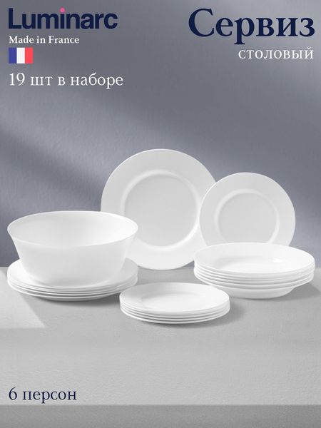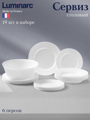 Добавьте стиль и элегантность в сервировку вместе со столовым сервизом Luminarc, который станет основой вашего кухонного ансамбля. В наборе вас ждет 19 предметов, способных обустроить стол на 6 персон, что делает его идеальным выбором как для повседневного использования, так и для торжественных случаев.Изготовленный из высококачественной стеклокерамики, этот сервиз обладает великолепной прочностью и долговечностью. Белый цвет и лаконичный дизайн без рисунков легко впишутся в любой интерьер, добавив атмосферы уюта и света.Преимущества:Удобство в уходе: можно мыть в посудомоечной машине, что значительно упрощает процесс очистки после яркого застолья.Использование в СВЧ-печи: сервиз безопасен для использования в СВЧ-печи, что позволяет легко разогревать блюда и подавать их на стол без лишних манипуляций.Стильный дизайн: отсутствие излишних деталей делает его универсальным для сочетания с различными стилями оформления и сервировками.
