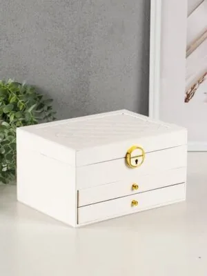 Эта белая шкатулка на три яруса — личное пространство для вашей коллекции украшений. Она создаёт идеальный порядок, где каждая вещь занимает своё место, защищая драгоценности от пыли и спутывания.ОсобенностиВнутреннее пространство организовано в три практичных яруса с отделениями.Запорный механизм с замочком обеспечивает сохранность ценных предметов.Классическая прямоугольная форма и белый цвет легко вписываются в любой интерьер.Компактные габариты 23×17.5×13.5 см экономят место на туалетном столике.Поверхность из качественной искусственной кожи приятна на ощупь и долговечна.Универсальная тематика делает шкатулку уместным подарком на 8 Марта, день рождения или без повода.Порядок в деталяхВерхний ярус с бархатными отделениями для самых любимых колец и серёг. Второй уровень с удобными отсеками аккуратно разместит браслеты и цепочки. Нижний, самый вместительный ярус, предназначен для объёмных аксессуаров. Вы всегда видите всю свою коллекцию и можете легко выбрать нужное украшение. Это решение, что избавляет от утренней спешки и поисков.