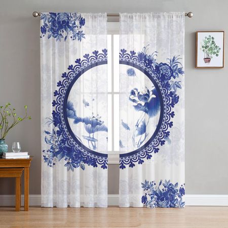 Синий цвет Классические листья лотоса Прозрачные шторы для гостиной Современные вуалевые шторы для спальни Тюль Шторы для оконных занавесок Декор W135 x H114cm