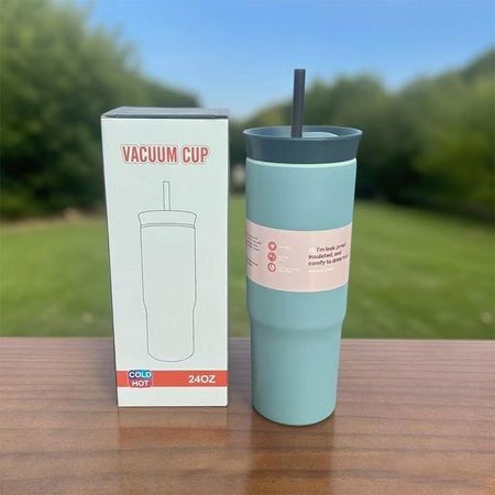Стальная Изолированная Нержавеющая Дорожная Кружка с Питьевой Соломинкой для Дома и Автомобиля Gray Blue
