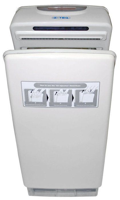 G-teq 8880 PW это сушилка для рук, оснащенная процессором управления, несколькими инфракрасными датчиками, а также контрастным ЖК-дисплеем. Высокоскоростной двигатель прибора создает мощный поток воздуха, направленный в разные стороны, благодаря чему время сушки рук составляет всего 6-10 секунд. Корпус представленной модели сушки для рук изготовлен из ударопрочного ABS пластика, который устойчив к механическим повреждениям. Обратите внимание, что прибор оснащен каплесборником, который необходимо опорожнять и тщательно промывать.