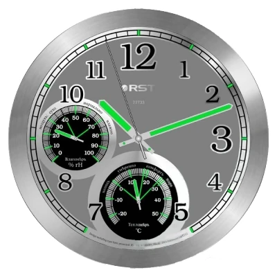 Rst 77733 это современный прибор, который можно смело назвать настоящей домашней метеостанцией! Данная модель по внешнему виду напоминает обыкновенные настенные часы, но при этом прибор измеряет не только ход времени, но и относительную влажность воздуха в помещении, и его температуру. Такая функциональность придется по душе тем, у кого дома есть маленькие дети. Еще одним достоинством таких часов является реализация возможности свободно пользоваться таким устройством в темное время суток, для чего все основные информативные элементы циферблата выкрашены флуоресцентной краской. Классический дизайн циферблата. Светящийся в темноте циферблат.