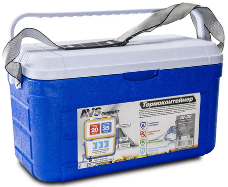 Термоконтейнер AVS (АВС) IB-20 изготовлен из прочного пластика и имеет общую вместимость 20 литров. Модель позволяет хранить продукты в прохладном состоянии до 35 часов. Продуманная конструкция корпуса оснащена удобной ручкой и регулирующимся плечевым ремнем для перемещения, а также есть специальный клапан, предназначенный для слива конденсата.