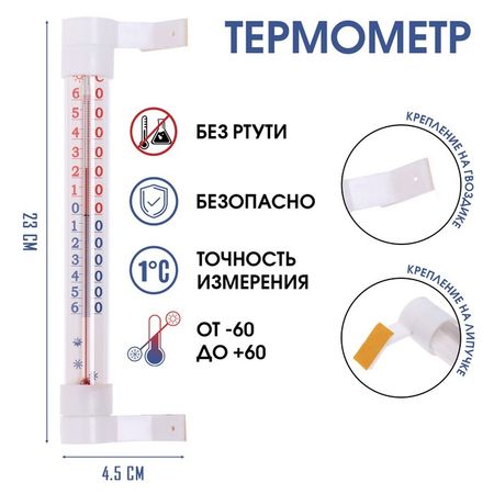 Термометр предназначен для измерения температуры воздуха в диапазоне температур от -60 до +60 градусов С. Цена деления: 1 градус С. Оконный термометр в стеклянном корпусе на двух ножках-кронштейнах, крепление — на гвоздики или двухсторонний скотч, имеется возможность крепления на две стороны окна. Подходит для пластиковых окон.Уличный термометр на окно — незаменимый помощник для тех, кто хочет всегда быть в курсе текущей температуры на улице. Этот уникальный градусник позволит вам легко и быстро определить, какая погода на улице. С его помощью вы сможете контролировать изменения температуры окружающей среды, не выходя из дома. Термометр надёжно крепится к окну. Он отличается точностью и надежностью измерений, поэтому вы всегда будете иметь достоверную информацию о температуре на улице. Легко читаемая шкала позволяет с легкостью определить текущую температуру даже с дальнего расстояния.