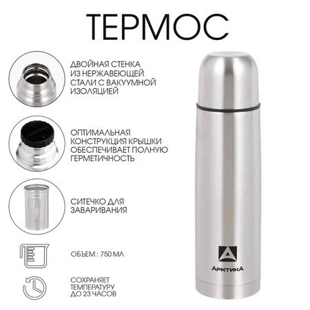 Термос «Арктика» 101, 750 мл, с ситечком, сохраняет тепло 24 ч, нержавеющая сталь