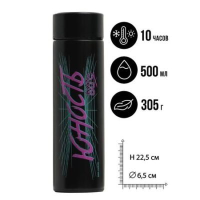 Идеальный аксессуар для активных пользователей и любителей горячих напитков.Преимущества термоса:– Изготовлен из высококачественной нержавеющей стали, которая защищает содержимое от внешних воздействий, а так же сохраняет вкус напитка неизменным.– Внутренняя часть крышки выполнена из пищевого пластика, силиконовый уплотнитель предотвращает протекания жидкости.– Оснащен индикатором температуры, что уменьшает риск обжечься.– Для отображения температуры на сенсорном монохромном экране используется встроенный аккумулятор, заряда которого хватает на 80 000+ отображений, его не нужно заряжать или менять батарейку.– В комплект входит съёмное ситечко для удобства в употреблении листового чая и лимонадов.– Оптимальный объем — 500 мл — не займет много места. Удобно брать с собой на учебу, работу или в путешествия.– Сохраняет температуру от 8 до 10 часов.– Отлично подойдет в качестве подарка близким.Не рекомендуем мыть в посудомоечной машине и нагревать в микроволновой печи.