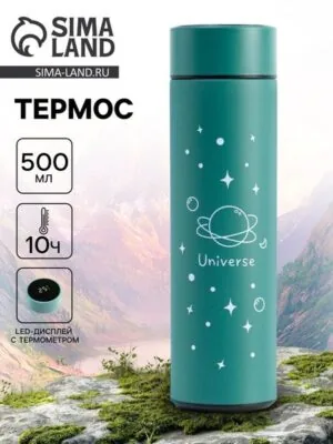 Термос для чая и кофе Вселенная «Мастер К» – инновационный подход к сохранению тепла!Термос «Вселенная Мастер К» объемом 500 мл сочетает в себе функциональность и современный дизайн. Bдеальный вариант для тех, кто предпочитает наслаждаться горячими напитками в течение всего дня. Специально разработанная конструкция поддерживает температуру горячих напитков до 10 часов, обеспечивая максимальное удовольствие от каждого глотка.Особенности:Объем: 500 мл – оптимален для одного человека на весь день.Материал: Изготовлен из высококачественной нержавеющей стали, пластика и силикона, что обеспечивает долговечность и легкость ухода.Герметичность: Надежная крышка предотвращает любые утечки и сохраняет тепло напитка.Ситечко: Поставляется в комплекте и устанавливается прямо в горлышко, позволяя наслаждаться напитком без необходимости использовать дополнительные емкости.Индикатор температуры: Сенсорный дисплей показывает текущую температуру содержимого, помогая контролировать степень нагрева.Батарея: Работает от одной одноразовой батарейки, что делает устройство портативным и удобным в использовании. Батарейка не подлежит замене.