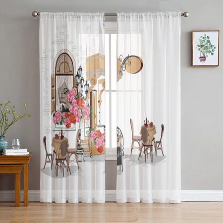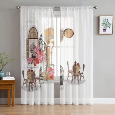 Тюлевая занавеска с видом на Старый город и уличное кафе для гостиной, прозрачная занавеска с балдахином для кухни, спальни, оконные шторы 135W x 114H(cm)