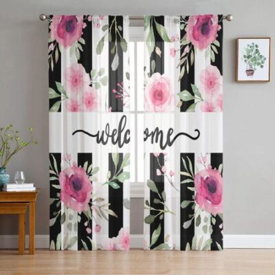 Тюлевые шторы с розовым цветком и черными полосками для гостиной, кухни, шифоновые занавески для спальни, балкона, прозрачные занавески, модный домашний декор 135W x 114H(cm)