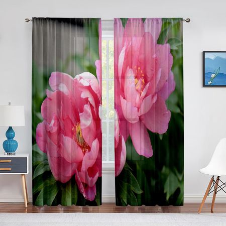 Тюлевые шторы с розовым пионом и зелеными листьями для гостиной, украшения дома, оконная занавеска, кухонная прозрачная занавеска из вуали 1 PCS W100XH250cm&Rod Pocket
