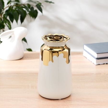 Элегантный штрих к любому интерьеру! Белая керамическая ваза с золотистым декором — это сочетание утонченной эстетики и универсальности. Этот аксессуар станет идеальным дополнением как для современных, так и для классических интерьеров.Универсальный дизайн: белоснежная керамическая поверхность удачно сочетается с декором золотистого оттенка. Такая конструкция подчеркивает изящество интерьера, притягивая взгляды благодаря изысканному оформлению.Идеальные размеры для стола: высота 20 см позволяет использовать вазу в качестве центрального декора или на полках, не перегружая пространство.Керамическая простота и прочность: материал изделия — керамика, придаёт изделию долговечность и устойчивость к внешним факторам.Широкий спектр использования: используйте её как самостоятельный элемент декора или заполняйте свежими цветами и сухоцветами для создания уникальной атмосферы.Добавьте шарм и стиль в свой дом: белая ваза станет ярким акцентом в вашем домашнем интерьере, подчеркнув ваш изысканный вкус к деталям. Это идеальный вариант для подарка и хорошее приобретение для тех, кто ценит гармонию и стиль.
