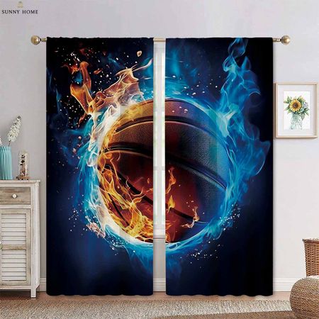 Вода Огонь Баскетбол Крутой Спорт 3D Печатный Карниз Для Штор Карман Для Мальчиков Девочек Комната Гостиная Кухня Декоративные Шторы 2 Части W50xH140(CM)x2PCSGrommet Top