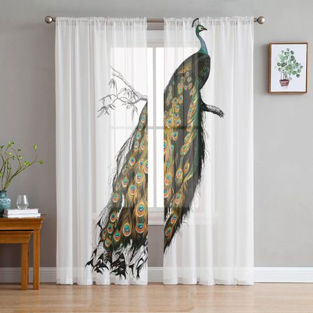 Зеленые занавески с павлиньими перьями, тюль на окно для гостиной, спальни, кухни, прозрачные шифоновые украшения для окон 1 PCS W100XH250cmGrommet Top
