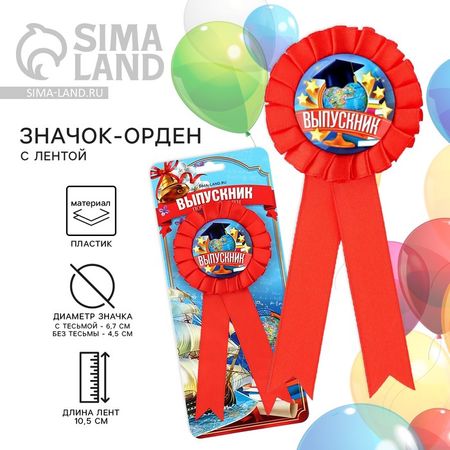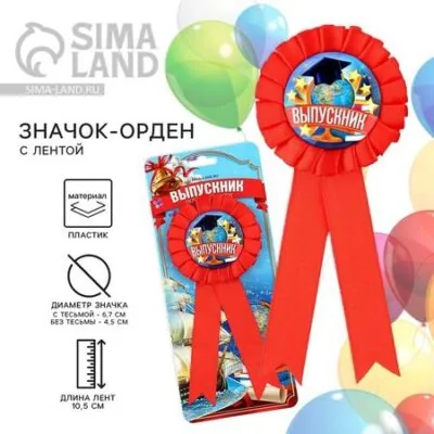 Значок — орден на выпускной «Выпускник», d=6.7 смВыпускной — это особое событие для каждого ребёнка. Сувенир изготовлен из лёгкого пластика и декорирован яркой текстильной лентой. Изделие дополнено булавкой на оборотной стороне, так что его сразу можно надеть на счастливого получателя. Каждый значок на булавке с лентой прикреплен к яркой, нарядной подложке — открытке, ребенку будет вдвойне приятно получить такой презент- диаметр значка (с тесьмой) 6,7 см;- диаметр значка (без тесьмы) 4,5 см;- длина лент 10,5 см.
