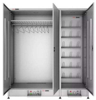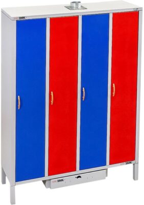 Двухсекционный шкаф ЗМК ШСО-08 оснащен тремя дверьми и применяется для сушки спецодежды, аксессуаров и обуви. Встроенный вентилятор и нагревательный элемент