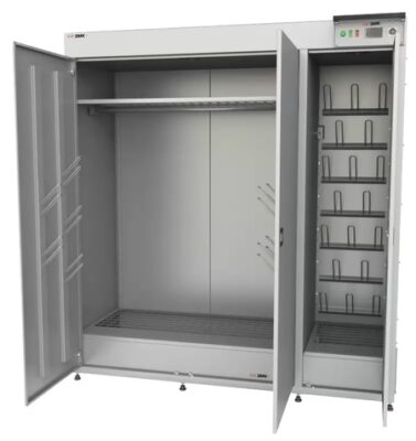 Компактный сушильный шкаф ЗМК ШСО-03 Комфорт устанавливается на пол и применяется на объектах, где требуется особый подход к сушке спецодежды.