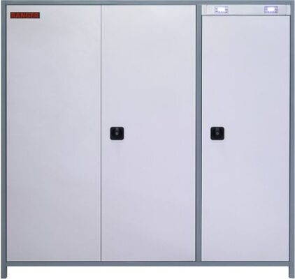 Сушильный шкаф КМК Рейнджер 8 Б оборудован тремя дверьми с ригельными замками и поставляется в разобранном виде. Первое отделение вмещает специальную одежду или бронежилеты за счет удобных перекладин. Второй отдел позволяет разместить обувь на специальных сушильных агрегатах для достижения лучшей эффективности.
