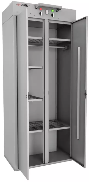 ЗМК ЛШС-02 это компактный двухдверный сушильный шкаф, изготовленный из стали высокого качества и прочности. В нем можно просушивать до четырех комплектов зимней одежды и до 8 летней. Что касается обуви, то в шкафу помещается 4 пары обуви одновременно. Слюдяной-миканитовый нагревательный элемент имеет мощность в 2 кВт.