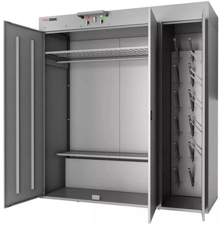 Сушильный шкаф ЗМК РШС-9-175 изготовлен полностью из стали и поставляется в разобранном виде. Модель имеет два просторных отделения со съемными полками, длинной штангой для плечиков и большим количеством навесов для сушки обуви, перчаток, головных уборов и иных аксессуаров. Одновременно в шкафу можно высушивать 9 комплектов зимней одежды или же 18 летней.