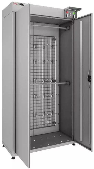 ЗМК Школьник-Р2ВУС это эргономичный, вместительный и в то же время достаточно компактный сушильный шкаф для одежды, головных уборов, аксессуаров и обуви. Внутреннее пространство шкафа оборудовано двумя перекладинами для плечиков, а также сеткой, на которой установлены 25 крючков.