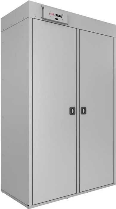 Металлический шкаф ЗМК Теремок РШС-15-120-18 оборудован вентилятором и нагревательным элементом для сушки вещей и обуви. Конструкция предусматривает 6 перфорированных полок для удобного размещения элементов гардероба. Верхняя часть шкафа оборудована двумя штангами, на которые подвешиваются плечики с одеждой.