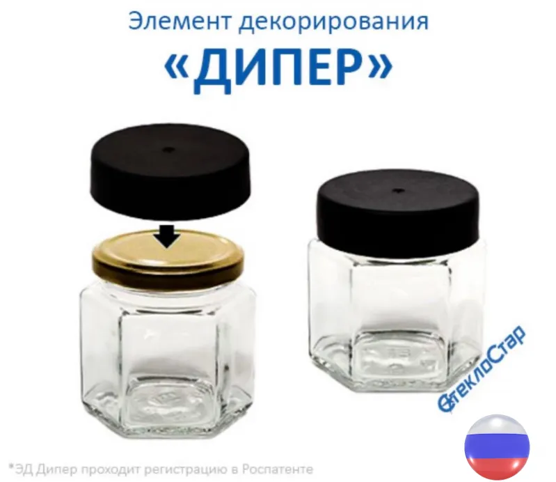 ЭД Дипер предназначен для изменения внешнего вида тары с крышкой твист-офф (сокрытия конструкционных особенностей). Плотно фиксируется на крышке. Фиксация исключает самопроизвольное разделение крышки твист-офф и насадки. Материал — полиэтилен.