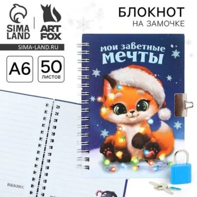 Блокнот на замочке станет прекрасным подарком на праздник.• Мечтай;• Записывай;• Выполняй.Вид обложки: твёрдая ;Формат: А6 ;Форма: прямоугольник ;Количество листов: 50 ;Линовка блока: линейка ;Тип скрепления: на гребне/спирали ;Упаковка: пакет.Состав: бумага, картон, металл, пластик.