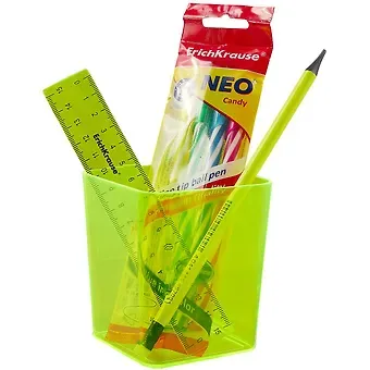 Готовый набор с наполнением. Универсальная подставка изготовлена из высококачественного пластика. В комплекте 6 предметов: 4 ручки, карандаш, линейка.