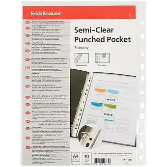 Прочная папка формата A4 из высококачественного пластика с прозрачными карманами-файлами. Внутренние файлы плотно закреплены в корешке папки.