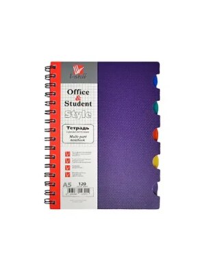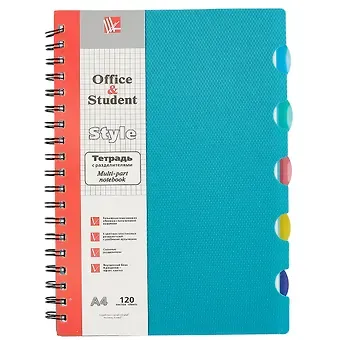 Тетрадь формата A4 на 120 листов в клетку от Listoff оснащена пластиковой обложкой и пятью цветными разделителями. Удобная спиральная пружина позволяет