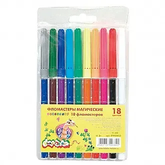 Фломастеры магические Каляка-Маляка позволяют получить 18 цветов из 10 фломастеров. Каждая картинка, нарисованная фломастером и проявленная фломастером-преобразователем, меняет цвет.