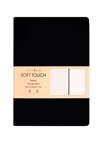Книга для записей А5 80л «SOFT TOUCH. Угольно-черный» интегр.обл., иск.кожа, офсет 70г/м2, тонир.комбин.блок (в лин., точку, без лин.), скругл.углы, цв.форзацы, цв.торец