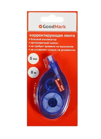 Корректирующая лента GoodMark идеально подойдёт для исправлений строчного текста на любых типах бумаги. Моментальное исправление ошибок, отличное письмо по исправленному, не требует времени для высыхания. Белая корректирующая лента одинаково хорошо покрывает все типы чернил. Подходит для печатных и рукописных текстов.