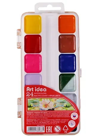 Главная » Все для офиса Краски акварельные Art idea, 24 цвета Просмотров 7 Акварель 24 цвета, в пластиковой упаковке, без кисточки, Art idea. В ассортименте, без возможности выбора.