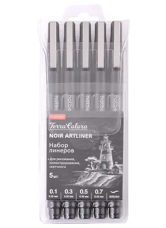 В наборе пять предметов: четыре линера с толщиной пера — 0.1 мм, 0.3 мм, 0.5 мм, 0.7 мм + одна ручка с наконечником-кистью.