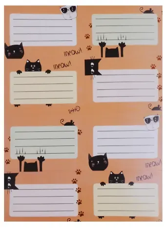 Главная » Все для офиса Наклейки для тетрадей 24шт «Meow» Просмотров 5 Наклейки для тетрадей 24шт. В упаковке 3 листа с 8 наклейками. Размер листа 14*19см. Размер одной наклейки 7*4,7см.