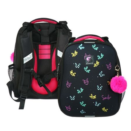 Ранец из формованного EVA-материала и высокопрочного непромокаемого полиэстера. Два вместительных отделения на реверсивной пластиковой молнии; в первом — «плавающие» перегородки для тетрадей и учебников, во втором – большой карман из сетки и карманы-органайзеры. Спинка с анатомическими элементами дополнительно укреплена пластиком, сверху – дышащая трехслойная сетка. Лямки-маечка плотные, мягкие. Регулируются по длине и высоте. Ранец снабжен нагрудным фиксатором и двумя боковыми карманами из прочной сетки. Есть мягкая ручка для переноски и дополнительная петлевая ручка для размещения ранца на крюке. На дне две пластиковые ножки. Ранец имеет светоотражающие элементы на лямках и корпусе. Брелок в комплекте.