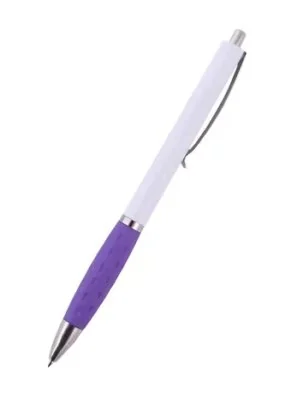 Автоматическая шариковая ручка со сменным стержнем. Толщина линии 0,4 мм. Цвет чернил — синий. Мягкая вставка (фиолетового цвета) с рельефными точками в зоне охвата пальцами. Точки расположены по схеме китайской лечебной практики ШИАЦУ. Крепкое сжимание и перекатывание ручки пальцами улучшает самочувствие. Корпус выполнен из качественного белого пластика. Прочные металлический клип, наконечник и кнопка.