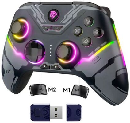 Погружение в игру с RGB подсветкой. Погрузитесь в увлекательное исследование любимой вселенной с помощью уникального дизайна RGB-подсветки беспроводного контроллера EasySMX X15. Световой индикатор RGB с 7 регулируемыми цветами глубже перенесет вас в мир игры.Основные характеристики:Тип: геймпадПодключение: проводное/беспроводноеПитание: от аккумулятораТип элементов питания: собственный аккумуляторЕмкость аккумулятора: 1000 мАчИнтерфейс подключения: BluetoothВиброотдача: даУправление: d-pad (крестовина); аналоговые стики; бамперы; кнопки; триггерыСовместимые платформы: Android; Nintendo Switch; PC; iOSОсобенности конструкции: подсветкаРадиус действия: 10 мДлина кабеля: 1 мГабариты: 10.6×15.5×5.7 смВес: 228 гЦвет: черный/серыйКомплектация:Беспроводной геймпад X15Кабель для зарядки USB-A/USB-CПриемник 2,4ГгцРуководство по эксплуатации