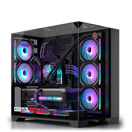 Игровой компьютер DigitalRazor Progaming с видеокартой Nvidia Geforce RTX 4080 Super и процессором Ryzen 7-7800X3D в черном цвете.