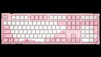 Кейкапы цвета баблгам, россыпь розовых цветов и восходящее солнце.