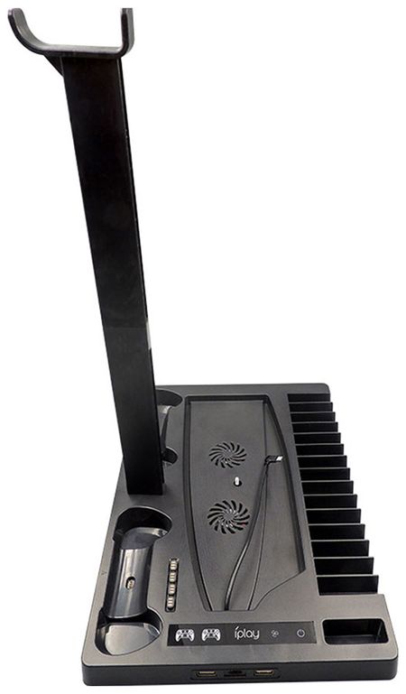 Многофункциональная подставка для игровой консоли PS5. Помимо консоли на подставке могут быть размещены все аксессуары: накладные наушники, контроллеры и 15 игр. Держатель для наушников съемный, устанавливается по мере необходимости. Во фронтальной части находятся индикаторы полной зарядки контроллеров. После достижения уровня 100 подзарядка контроллеров прекращается автоматически. Предусмотрены 2 полноценных USB порта и один USB Type. Имеются 4 адаптера USB-С. Паз для хранения пульта ДУ.Однако, главная и ключевая особенность стенда — дополнительный приток воздуха к вентиляционным отверстиям игровой приставки. Дополнительный приток воздуха особенно необходим при запуске AAA-проектов, которые способны задействовать всю вычислительную мощь консоли — повышенная нагрузка сопровождается увеличением нагрева материнской платы.Характеристики:Многофункциональная подставкаСовместимость: для PS52 вентилятораПазы для подзарядки контроллеровДержатель наушниковПазы для хранения 15 игр2x USB-A 1x USB-CИндикатор полной зарядки контроллеров4 адаптера USB-C