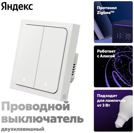 Умный выключатель Яндекс YNDX-00532 заменяет обычные выключатели и открывает множество возможностей для управления освещением и приборами. Используйте голосовые команды через Алису, удалённый доступ через приложение Дом с Алисой, автоматические сценарии или привычные нажатия клавиш. Устройство легко монтируется в стандартный подрозетник.Выключатель позволяет не только управлять светом локально, но и проверять его состояние из любой точки мира. Вы можете настроить расписание, например, чтобы свет включался утром с будильником, или объединить его с другими устройствами: свет активируется по датчику движения, а вентилятор по уровню влажности.Каждая клавиша поддерживает до трёх сценариев для одинарного, двойного и длительного нажатия, что позволяет управлять как подключёнными устройствами, так и запускать сложные сценарии, такие как закрытие штор или запуск пылесоса.Устройство выполнено из пожароустойчивого пластика класса V0, с вентиляционными отверстиями для отвода тепла. Протокол Zigbee обеспечивает надёжную работу даже без подключения к интернету. Для использования потребуется приложение Дом с Алисой и хаб Zigbee (например, Яндекс Станция).Характеристики:Тип: выключательКоличество клавиш: 2 штМатериал корпуса: пластикПодсветка: естьЧастота радиосигнала: 2400 МГцКоличество линий управления: 2Защита: IP20Модель потребления: от сетиНапряжение питания: 220 ВПульт ДУ: нетВысота: 80 ммШирина: 80 ммГлубина: 36 ммВес: 110 гУправление и функции:Функции: дистанционное управление светом, управление питанием электрических приборовДиммирование: нетВид управления: дистанционное управление, клавишиПротокол передачи данных: ZigbeeГолосовой помощник: Алиса