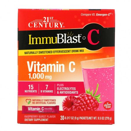 †† Электролиты По сравнению с Emergen-C® Смесь для приготовления шипучих напитков с натуральным подсластителем15 питательных веществ7 витаминов группы ВЭлектролиты и антиоксидантыС натуральным подсластителемБез искусственных ароматизаторовПищевая добавкаНе содержит глютенаНе содержит добавленных дрожжейПродукт прошел лабораторные испытания — гарантированное качествоУсильте вкус! Выберите интенсивность вкуса. Чем меньше воды вы используете, тем насыщеннее вкус!Берите его с собой!Удобно наливать в бутылки с водой и получать питательные вещества в пути!Смесь для приготовления напитка 21st Century® ImmuBlast®-C содержит 1000 мг витамина С, а также витамины группы B, цинк и антиоксиданты, которые помогают поддерживать здоровье иммунной системы.Хорошее самочувствие: витамин С, цинк и антиоксиданты поддерживают здоровье иммунной системы.Энергия: в ежедневном рационе витамины группы В играют ключевую роль для поддержки энергетического метаболизма.Электролиты: поддерживают здоровую гидратацию и способствуют выработке и использованию энергии.
