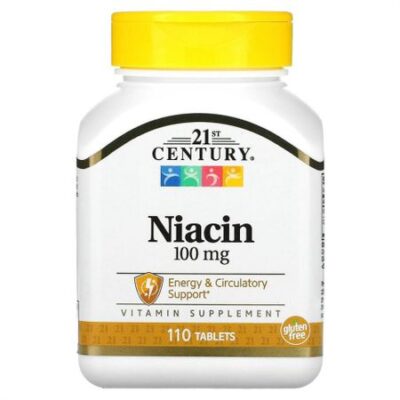 Пищевая ценностьРазмер порции: 1 таблеткаКоличество в 1 порции% ОТ СУТОЧНОЙ НОРМЫ†Ниацин100 мг625%Кальций (в виде карбоната кальция)160 мг12% Поддержка энергии и кровеносной системыВитаминная добавкаНе содержит глютенаГарантированное качество — продукт прошел лабораторные испытанияНиацин (витамин B3) влияет на энергетический обмен.
