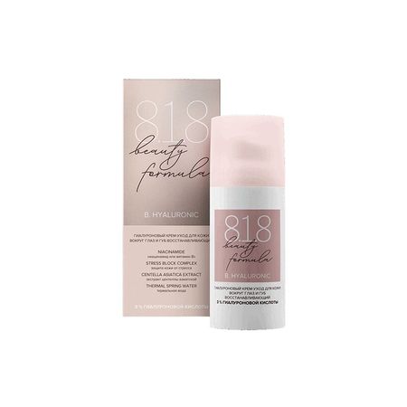 8.1.8 Beauty formula — трехфазная система профилактики и защиты кожи от стресса. Восстанавливает эпидермальный ресурс. Омолаживает кожу. Создана для чувствительной кожи женщин мегаполиса, испытывающих дефицит сна и отдыха.Гиалуроновый крем для кожи вокруг глаз и губ разглаживает и укрепляет нежную кожу. Гиалуроновая кислота (низко-, средне-и высокомолекулярная) в концентрации 3 % в сочетании с расширенным комплексом витаминов А, В3 (ниацинамид). Е, С, натуральными антиоксидантами и Stress Block Complex влияет на повышение тургора, сокращение морщин и защиту кожи от стресса. Ниацинамид (витамин Вз) удерживает влагу в эпидермисе, активизирует синтез коллагена. Композиция натуральных экстрактов -центеллы азиатской, виноградных косточек, конского каштана — укрепляет стенки сосудов, снижает отечность, способствует уменьшению «мешков» под глазами, оказывает омолаживающий эффект. Минерализующая вода из термального источника на юге Франции обладает успокаивающим и восстанавливающим действием.Укрепляет и разглаживает тонкую нежную кожу вокруг глаз и губ. Повышает упругость и увлажняет. Снижает отечность вокруг глаз и убирает «мешки под глазами». Подтягивает и делает более плотной кожу вокруг губ.8.1.8 beauty formula сохраняет естественную красоту кожи. Активные компоненты: 3 вида гиалуроновой кислоты, ниацинамид, экстракт виноградных косточек, экстракт конского каштана, кофеин, экстракт центеллы азиатской, Stress Block Complex, витамин A, витамин С, витамин Е, соевое масло, сафлоровое масло, масло виноградных косточек, термальная вода