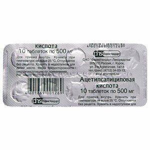 Ацетилсалициловая кислота — нестероидный противовоспалительный препарат. Препарат выпускается в форме таблеток (500 мг).Препарат оказывает анальгезирующее, жаропонижающее и противовоспалительное действие. Применяется при симптоматическом лечении болевого синдрома, головной боли (в том числе при абстинентном синдроме), зубной боли, боли в горле, мигренозной боли, боли в спине и мышцах, боли в суставах, боли при менструации, а также при повышенной температуры тела во время простудных и других инфекционно-воспалительных заболеваниях (у взрослых и детей старше 15 лет).Имеются противопоказания (в том числе, беременность, детский возраст и др.). Отпускается без рецепта.