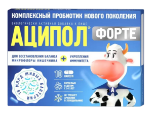 АЦИПОЛ ФОРТЕ — Биологически активная добавка (БАД) к пище — комбинация живых пробиотических лакто- и бифидобактерий (10 млрд в каждой капсуле) и цинка для взрослых и детей с 3 лет.Внешний вид и свойства: белые капсулы с содержимым от светло-кремового до светло-коричневого цвета.БАД «Аципол® Форте» отличается:1. Сбалансированным составом: 5 млрд лактобактерий rhamnosus GG, 5 млрд бифидобактерий longum — наиболее хорошо изученных, широко применяемым во всем мире1, и микроэлемент цинк, известный своим положительным влиянием на иммунную систему.2. Универсальностью: действие штаммов, входящих в состав БАД «Аципол® Форте», направлено на восстановление баланса микрофлоры кишечника и поддержание функции иммунной системы.3. Удобством приёма: 1 капсула 1 раз в день, капсулу можно вскрыть и смешать с жидкостью или едой, хранить без холодильника.4. Безопасностью: разрешён для детей с 3 лет, а также в период беременности и грудного вскармливания.Состояние микрофлоры кишечника является основой как физического, так и эмоционального здоровья. Сдвиг баланса между полезными и условно-патогенными бактериями лежит в основе многих хронических заболеваний. При этом нарушение этого равновесия именуется дисбактериозом кишечника. Причин, нарушающих баланс кишечной микрофлоры и приводящих к дисбактериозу, может быть много: приём лекарственных препаратов, стресс, несбалансированное питание, заболевания желудочно-кишечного тракта, смена климатических условий и рациона питания, нарушение биоритмов, дальние поездки, снижение иммунитета. 2Проявления дисбактериоза кишечника неспецифичны3. У детей нарушение баланса микрофлоры кишечника может быть связано с появлением избыточного газообразования и срыгивания, нарушением стула (запор/диарея), частыми простудными заболеваниями, появлением признаков атопии.4 Возможными сигналами о сдвигах в нормальном балансе микрофлоры кишечника являются, беспокоящее чувство урчания в животе, отрыжку и неприятный вкус во рту, аллергические проявления, нарушение всасывания нутриентов, снижение иммунитета5.Как помочь своему организму при нарушении баланса нормальной микрофлоры кишечника? Особое внимание стоит уделить пробиотикам — живым микроорганизмам, которые при применении в адекватных количествах вызывают улучшение состояния здоровья организма — хозяина. Они играют важную роль в снижении риска возникновения кишечных инфекций, подавляя рост патогенных микроорганизмов и препятствуя повреждению слизистой оболочки кишечника. Кроме того, пробиотики применяют для поддержания иммунной системы, с целью повышения защитных сил организма.В состав БАД «Аципол® Форте» входят два пробиотических микроорганизма — бифидобактерии (Bifidobacterium longum CECT 7894) и лактобактерии (Lactobacillus rhamnosus ATCC 53103).Лактобактерии широко используются для нормализации функций пищеварительного тракта, способствуя восстановлению нормальной микрофлоры кишечника. За счет образования ассоциации с клетками слизистой оболочки кишечника, лактобактерии участвуют в формировании местного иммунитета. Лактобактерии в процессе своей жизнедеятельности синтезируют компоненты, которые обеспечивают антибактериальный эффект по отношению к представителям патогенной и условно-патогенной флоры. Кроме того, лактобактерии участвуют в синтезе аминокислот, белков, ви