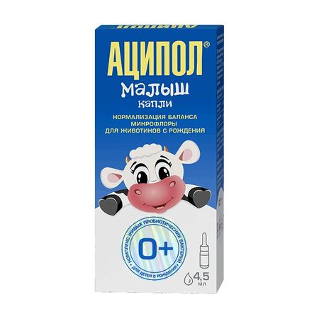Фармакологическое действие Аципол® Малыш — пробиотик для детей с первых дней жизни, содержащий комплекс полезных бактерий, способствующих снижению риска появления дисбактериоза у младенцев и нормализации кишечной микрофлоры с рождения. Действие продукта Аципол® Малыш обусловлено свойствами входящих в состав активных компонентов лактобактерий Lactobacillus rhamnosus и бифидобактерий Bifidobacterium longum. Лактобактерии (Lactobacillus rhamnosus) Лактобактерии способствуют: синтезу соединений, угнетающих рост патогенных микроорганизмов; образованию молочной кислоты (созданная таким образом кислая среда благотворно влияет на развитие бифидобактерий); снижению риска развития дисбаланса микрофлоры; повышению неспецифической резистентности организма; повышению активности фагоцитов и повышению уровня иммуноглобулинов (IgA); Лактобактерии Lactobacillus rhamnosus обладают иммуномодулирующим эффектом и способствуют поддержанию здоровья полости рта у детей. Бифидобактерии (Bifidobacterium longum) Наравне с другими представителями нормальной флоры кишечника, бифидобактерии принимают активное участие в пищеварении и всасывании, способствуют процессам ферментативного переваривания пищи, нормальной перистальтике кишечника и эвакуации кишечного содержимого, синтезу витаминов в кишечнике, лучшему усвоению питательных веществ, поддерживают нормальные процессы пристеночного пищеварения, подавляют рост патогенной микрофлоры. Комплексы, содержащие лактобактерии и бифидобактерии (включая Lactobacillus rhamnosus и Bifidobacterium longum), согласно ряду исследований, отличаются хорошей переносимостью, благоприятным профилем безопасности, способностью снижать риск развития функциональных нарушений работы ЖКТ. Пробиотические бактерии в составе Аципол® Малыш широко используются для производства пищевых молочных продуктов и детского питания во всем мире. Они не подвергались генетической модификации и считаются безопасными. Полезные бактерии в составе продукта Аципол® Малыш способствуют устранению проявлений дисбактериоза у новорожденных детей и грудничков. Аципол® Малыш не содержит лактозу, поэтому может применяться для нормализации микрофлоры кишечника у детей с лактазной недостаточностью.