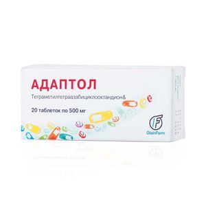Показания к применению Неврозы и неврозоподобные состояния (раздражительность, эмоциональная неустойчивость, тревога и страх), для улучшения переносимости нейролептиков и транквилизаторов с целью устранения вызываемых ими соматовегетативных и неврологических побочных эффектов, кардиалгия различного генеза (не связанная с ИБС), никотиновая абстиненция (в составе комплексной терапии в качестве средства, снижающего влечение к курению табака).Применение при беременности и кормлении грудьюПротивопоказано применение препарата при беременности и в период лактации (грудного вскармливания).Противопоказания Беременность, период лактации (грудного вскармливания), повышенная чувствительность к компонентам препарата.Побочное действиеРедко: головокружение, понижение АД, диспептические расстройства, аллергические реакции (кожная сыпь, зуд). При применении в высоких дозах: бронхоспазм, понижение температуры тела, слабость.СоставДействующее вещество: Тетраметилтетраазабициклооктандион — 500 мг.Взаимодействие с другими препаратамиВозможно одновременное применение Адаптола с нейролептиками, транквилизаторами (в т.ч. бензодиазепинами), снотворными средствами, антидепрессантами и психостимуляторами.